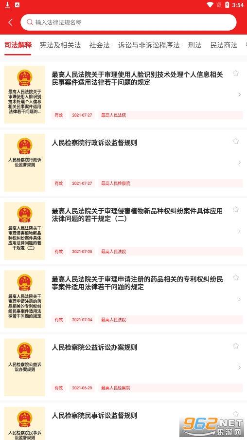 1. 法律法规详细分类,一键查找。包含最高法颁布的全部法律法规大全及司法解释,能够方便地查阅相关的法律法规数据库中司法解释及案例。