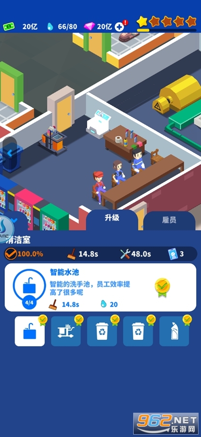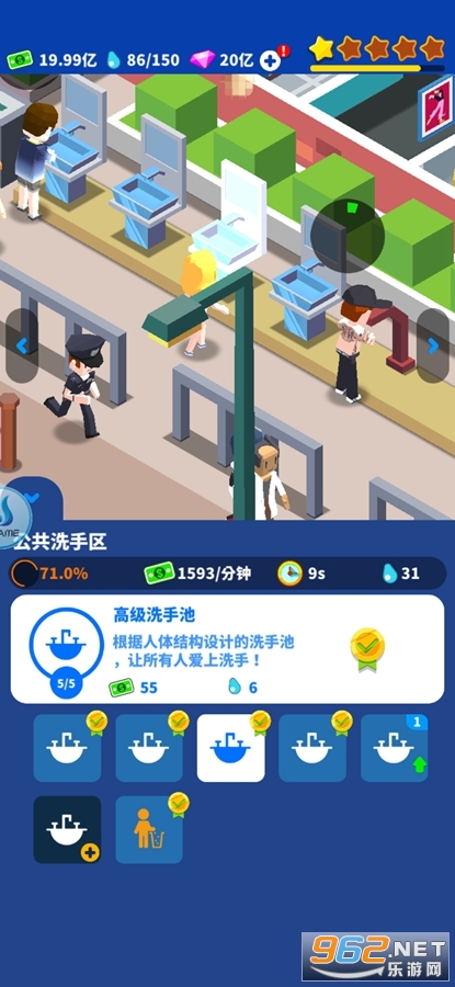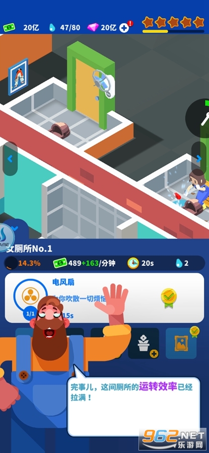 趣味的经验游戏,玩家将开设一家厕所公司,可以不管的购买和升级厕所的设备,还可以放上花盆壁画等来增加格调,有男厕所也有女厕所,喜欢的朋友可以下载试试。