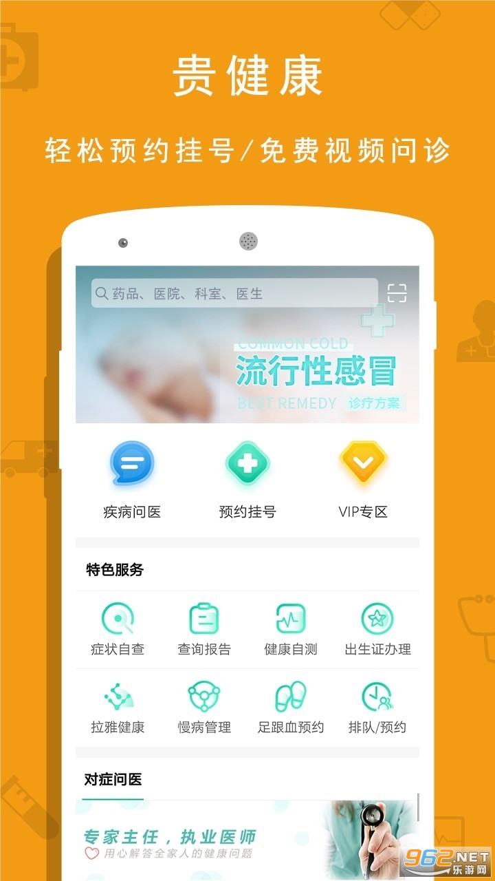 《贵健康绿色版》是一款医疗健康服务应用,软件依托强大的数据库,致力为用户提供最便捷,全面,安全,满意的服务,在这款软件上,你可以预约挂号,名医名院任你选,免去你的排队挂号之哭,是一款很实用的医疗软件。