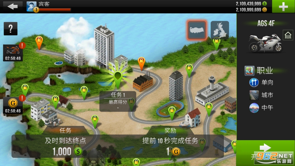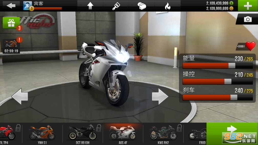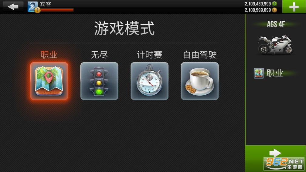 在具体模式上,《公路骑手》提供闯关模式的职业赛、一撞即死的无尽赛、争分夺秒的计时赛和随心所欲的自由驾驶。在这些模式下,玩家可以通过赢得比赛获取金币以解锁和升级更多高性能机车——不过别担心最初的车辆不够刺激,即便是最普通的轻摩也能让游戏者感受到脊背发凉。