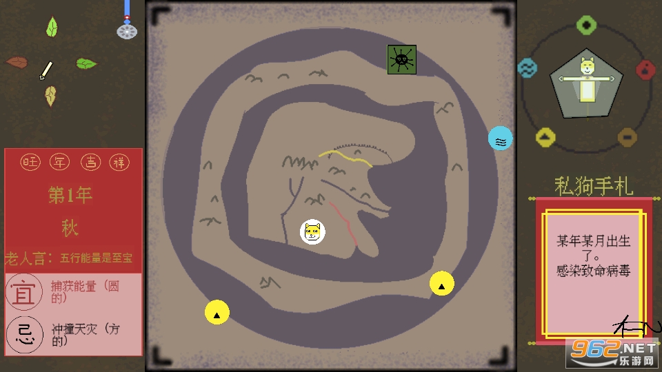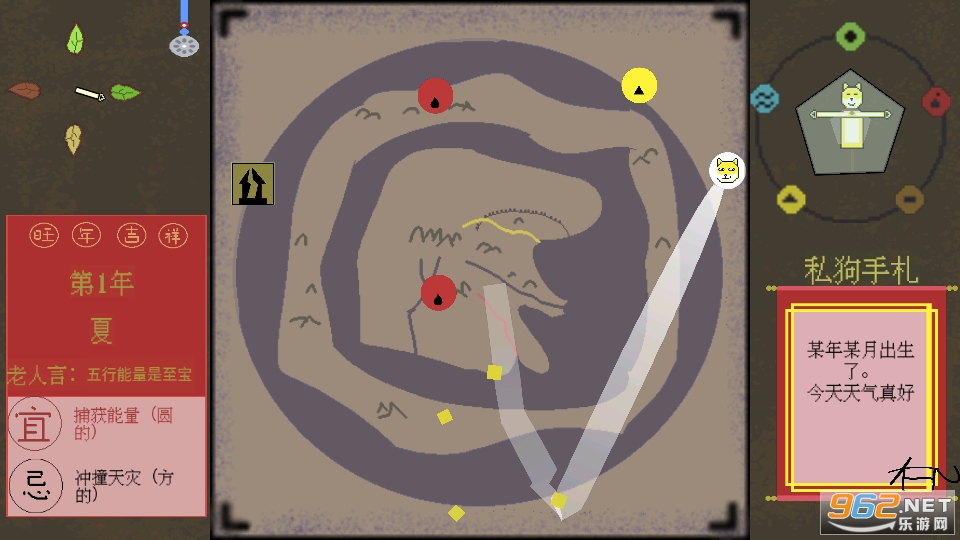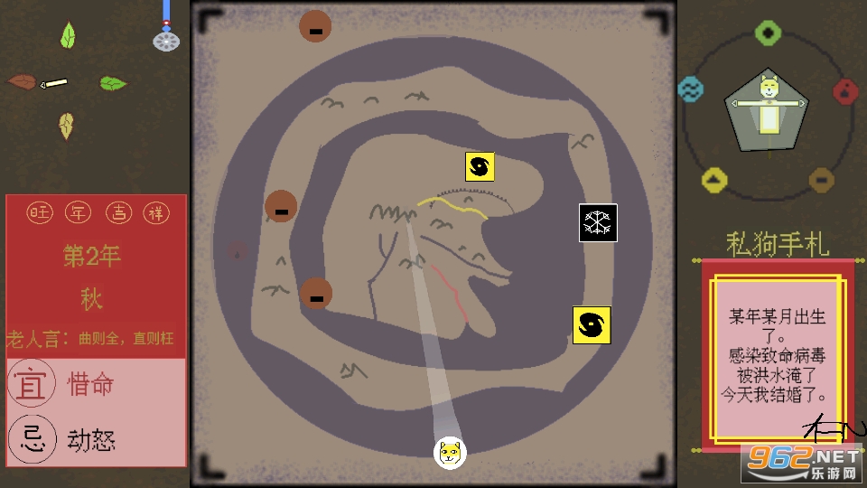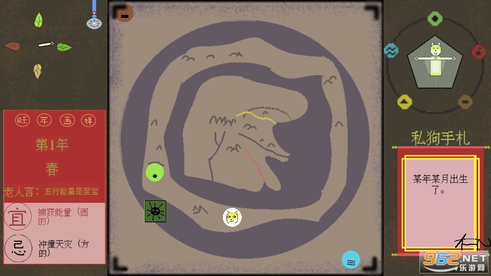 天地不仁,以万物为刍狗。 本游戏为像素风的生存小游戏,旨在让玩家能够用生动有趣的方式去了解传统文化中的五行生克观念。 玩法简单,只需要点击屏幕中央的舞台,狗子就会按照方向奔跑捕捉五行能量,以维持生存。 庄生晓梦迷蝴蝶,谁是刍狗? 一起来体验吧~