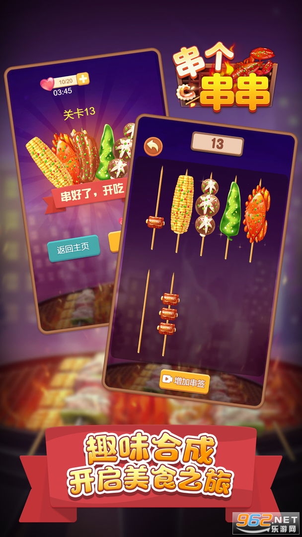 欢迎来到白天刷不到,晚上逃不掉系列之《串个串串》,试问有谁能抵挡住深夜串串的诱惑呢?在本串串店中有豆腐、鸡翅、火腿肠、烤鱼等数十种菜品,你只需要将相同的菜品串到一起,就能升级成香喷喷的美味串串。随着关卡的增多,串串的数量也会不断递增,菜品的种类也会更加丰富,想吃到更多串串不仅需要耐心还需要高超的技术,只有灵活的组合搭配菜品才能完成挑战。还在等什么,快来开动思维升级你的美味串串吧!