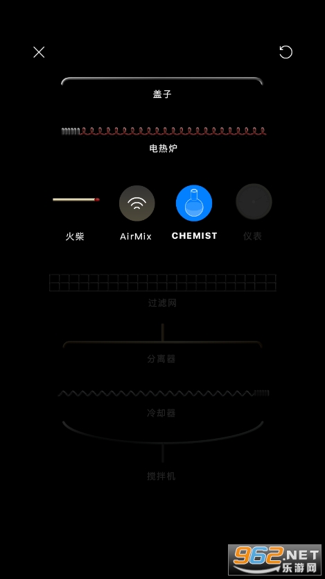该作的UI设计非常简洁,简洁到第一眼完全看不懂能干啥。点击右上角的圈圈可以打开材料栏,其中有近150种不同形态(气、液、固)的物质(或材料或试剂),这些物质均有汉语名称以及对应化学式显示,你只需要选中你心目中的那个丢进烧杯即可,阿勒,你问我这有什么用,那我问谁去。