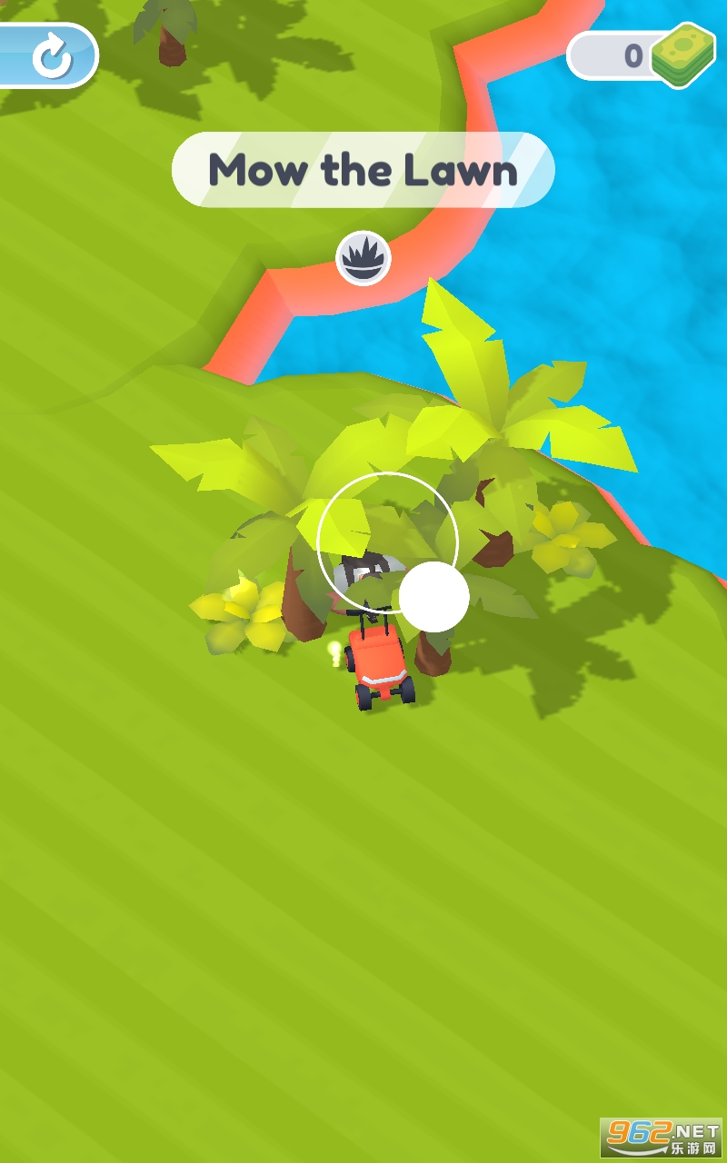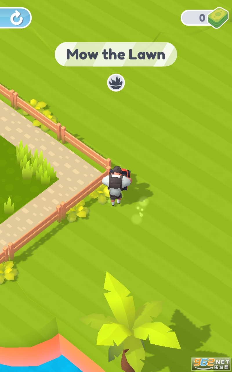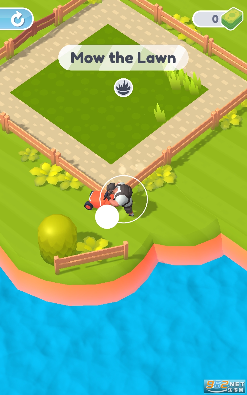引导你的割草机在郁郁葱葱的花园和迷人的房子周围移动;不留下未修剪的草叶。