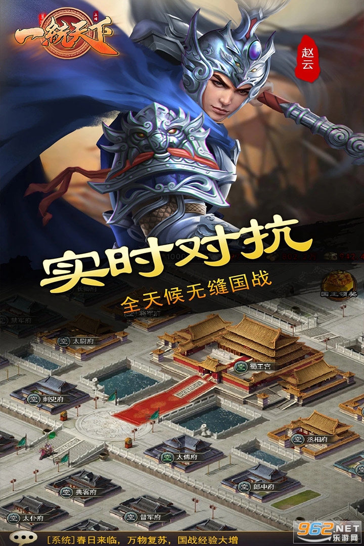 国战,身临其境——《三国一统天下》分为魏、蜀、吴三个国家势力,真实还原地形版图,烽火狼烟,战火连天,让您身临其境,杀敌百万,做真正的无双上将!