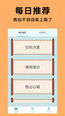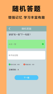 1、数千个成语随机出现,提升你的词汇量,让你一鸣惊人;