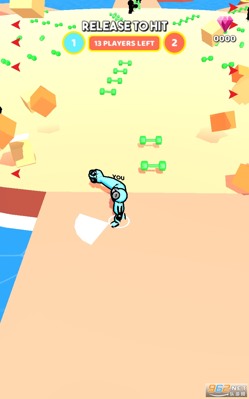 1、点击开始游戏,随意滑动屏幕控制角色移动获取哑铃,增强麒麟臂。