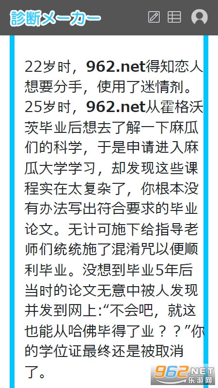 25岁时,962.net从霍格沃茨毕业后想去了解一下麻瓜们的科学,于是申请进入麻瓜大学学习,却发现这些课程实在太复杂了,你根本没有办法写出符合要求的毕业论文。无计可施下给指导老师们统统施了混淆咒以便顺利毕业。没想到毕业5年后当时的论文无意中被人发现并发到网上:“不会吧,就这也能从哈佛毕得了业??”你的学位证最终还是被取消了。