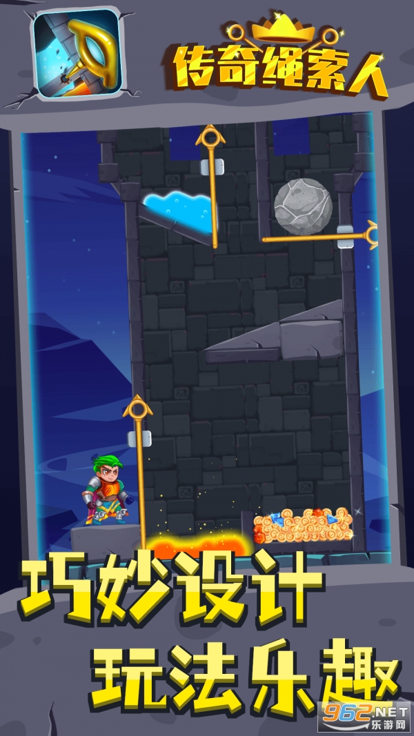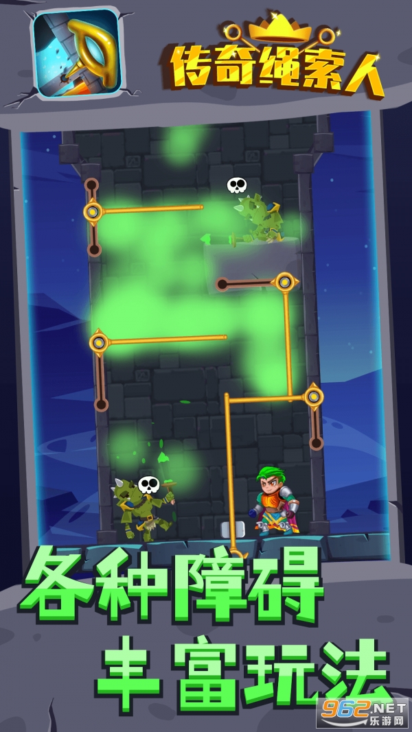 传奇绳索人是一款经典的抽针解谜游戏。传奇绳索人游戏画风比较简洁,可爱小公主等你拯救,注意躲避龙,狼,怪物,正确顺序抽针就能锁住传奇绳索人游戏中的怪物,救出公主获取宝藏,更有超多皮肤任你解锁。