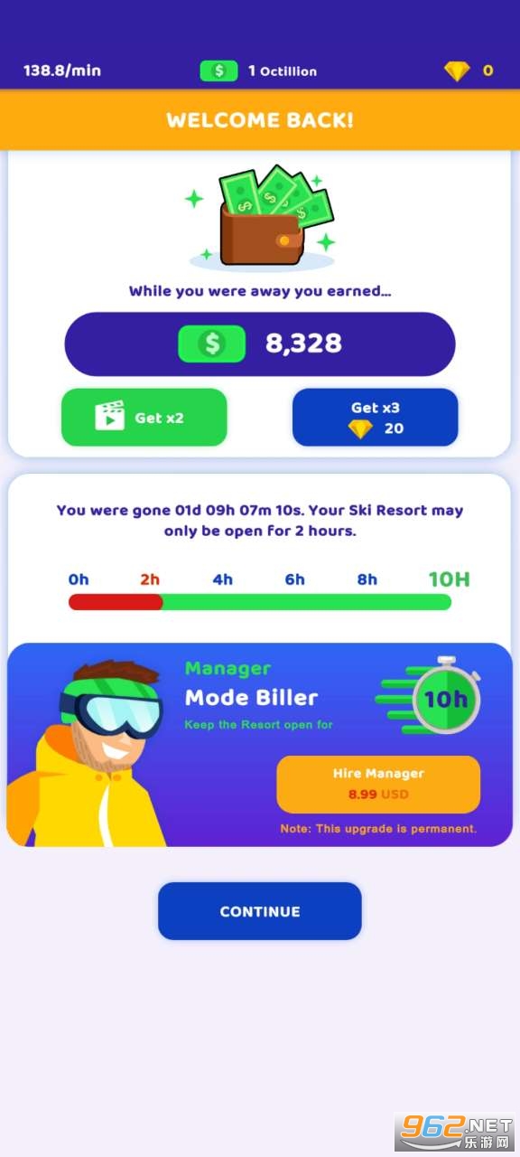 建立一个闲置的滑雪帝国,管理您的酒吧和餐厅,成为雪上大亨!发展您的业务,赚钱并管理您的滑雪胜地帝国。成为一个闲置的点击器大亨和亿万富翁!