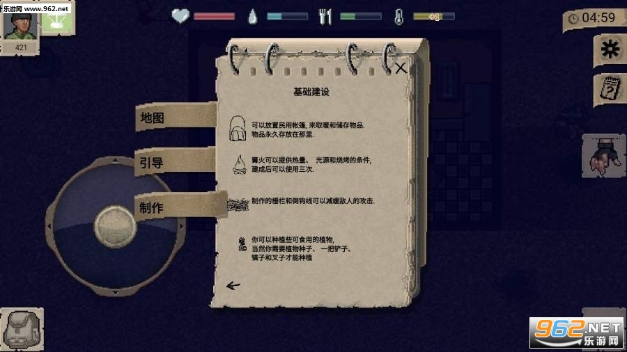独特的像素风格,趣味的游戏内容,一切只为了能够活下去,在这地图场景中探索,寻找幸存的人类和各种资源,你需要保持各项生理数据的健康,还要与僵尸战斗。