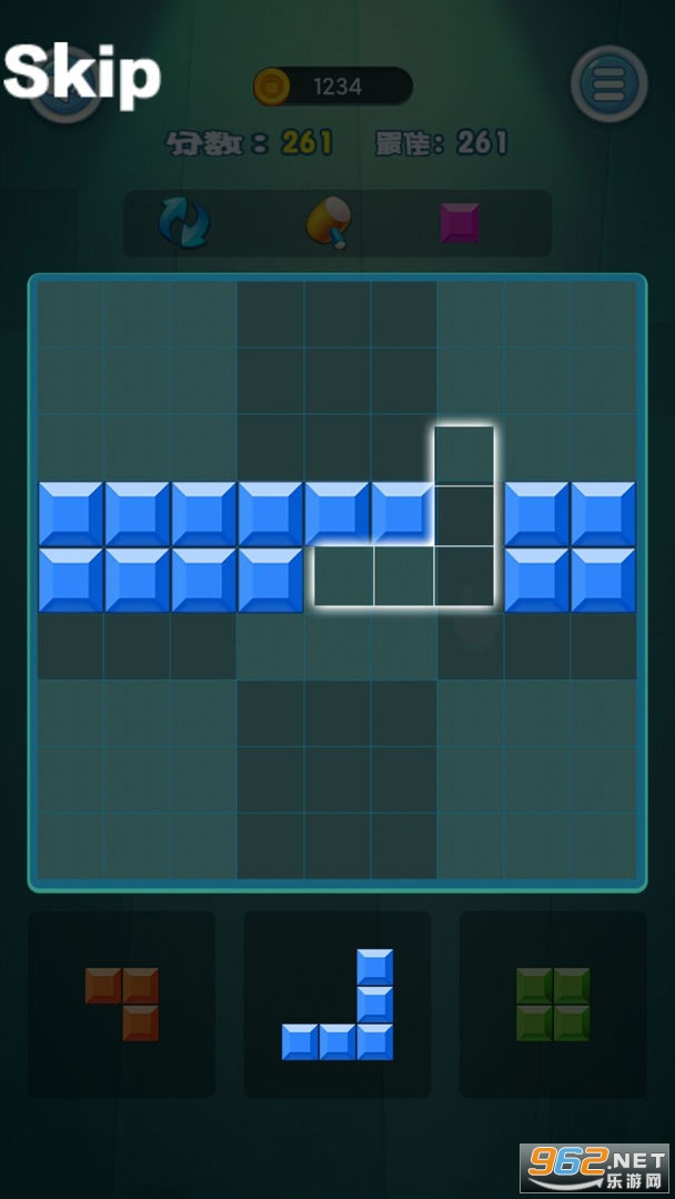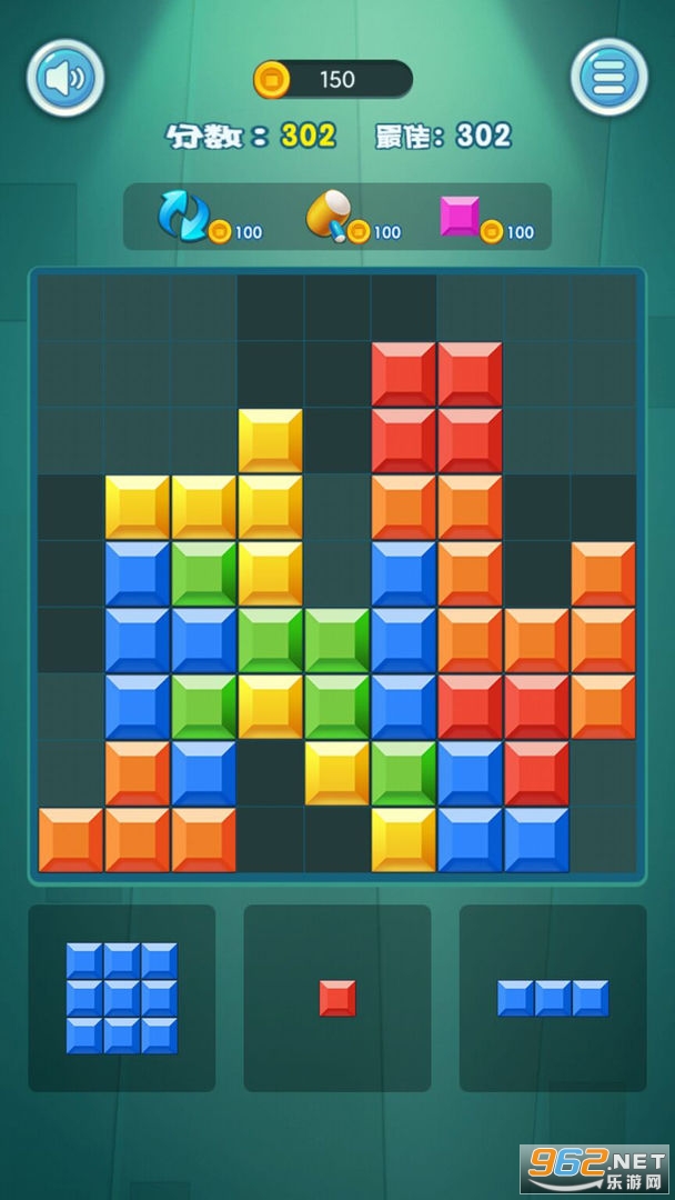 将方块拖进棋盘中,使各个不同形状的方块能够填满棋盘中的任意一个九宫格或行/列后,合并消除得分。如何将更多的方块填进棋盘中是游戏的关键哦!