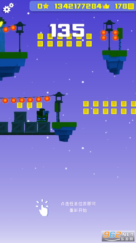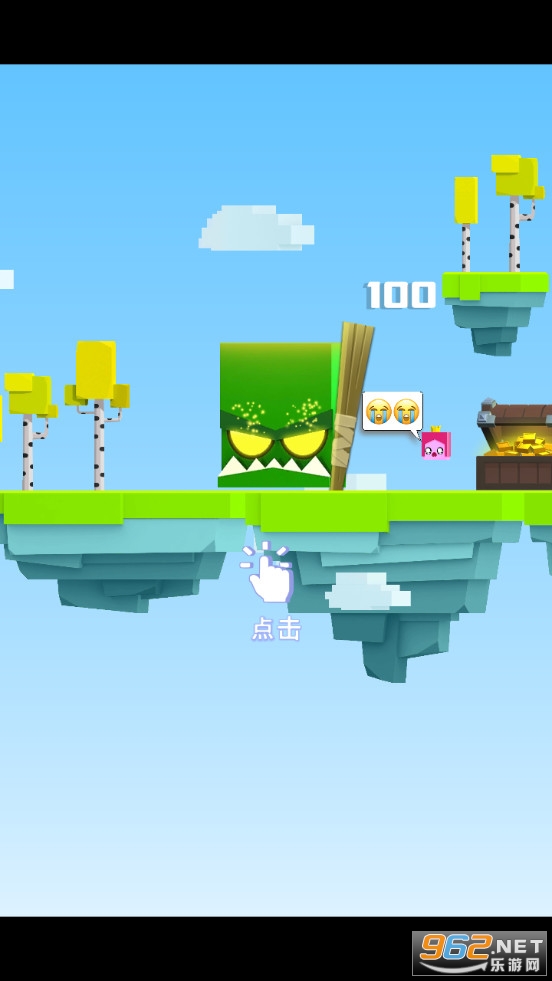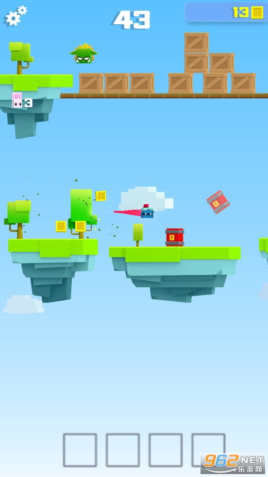 同样是简单的魔性动作无限闯关,点击屏幕控制不断跳跃的角色向前段位移动一定距离,道路由一个个悬浮的小岛屿组成,一系列大大小小的绿色怪物,设有武器宝箱和补给宝箱,武器宝箱可以获得头盔对应的任意武器,累积可以提升等级,仅在单次生命有效