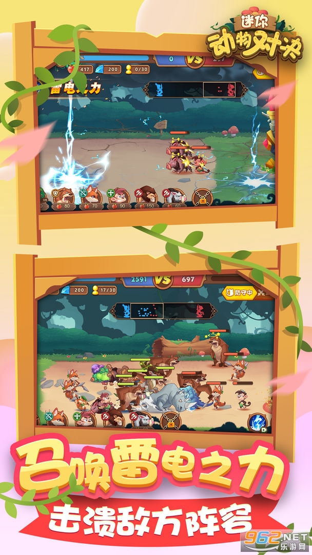 《迷你动物对决(动物对决模拟器)》是一款全新的创意塔防游戏,采用了Q版卡通风的画面设计,动物版的推式塔防,玩法有点类似之前的动作卡牌游戏刀塔传奇,里面有猴子,大象,犀牛,狮子,老虎,熊等等数十种不同的动物,玩家可以自由的收集这些动物的卡牌,搭配阵容,在游戏里面刺激对战,赢得胜利!