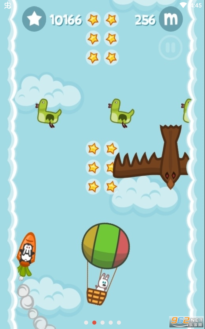 总体来说是一款非常不错的自下而上的跑酷类游戏,玩家们在游戏中需要做到的就是灵活的滑动手指让你的兔子乘坐着胡萝卜一直往上升,躲避路上的各种障碍物,喜欢的亲们赶紧下载吧。
