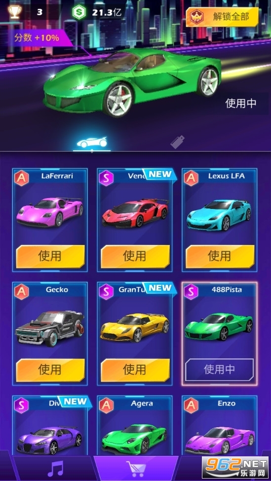 很多酷炫的车辆外形,不同的样式和颜色,自定义你的赛车