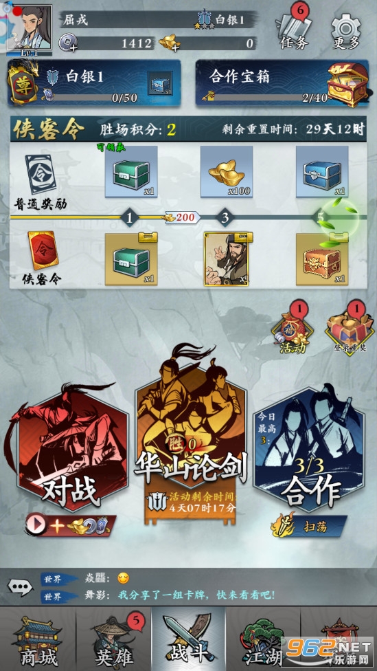 武侠风格的卡牌策略游戏,玩家需要合理的搭配自己的角色,合并强化,提高角色的属性,有着对战、华山论剑、合作等多种不同的玩法,喜欢的朋友可以下载试试。