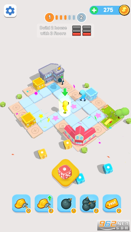 进入游戏后,点击掷骰子,根据点数移动到相应的位置,使用道具或金币建造房子,然后继续,直到用完所有的金币和道具。