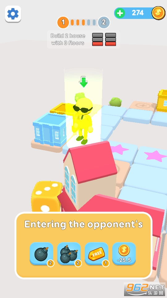 使用炸弹拆毁对手的房子,一颗炸弹的炸毁一层,三颗炸弹夷为平地。