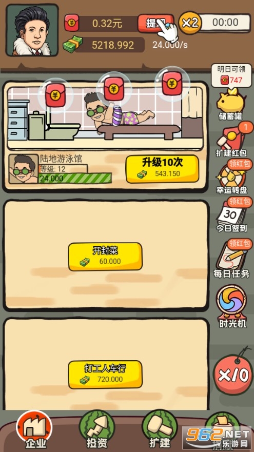 《西瓜市首富》是一款通过放置挂机就能赚钱的游戏,虽然不是西红柿首富,但你可以成为西瓜市的首富嘛,通过你独到的商业眼光,在我们的西瓜市去投资,开餐馆、酒店、游泳馆,甚至还能开办学校,只要资金到位,什么你都可以去投资。