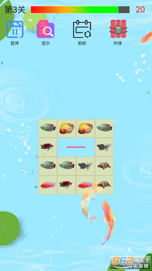 游戏规则看似简单,但是整体的节奏还是很快的,当你看着上面的时间条在逐渐消失的时候会感到一丝丝心慌,镇定下来,认真去观察,找到更多可以连线匹配的鱼类,去获取更高的分数。