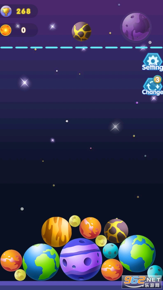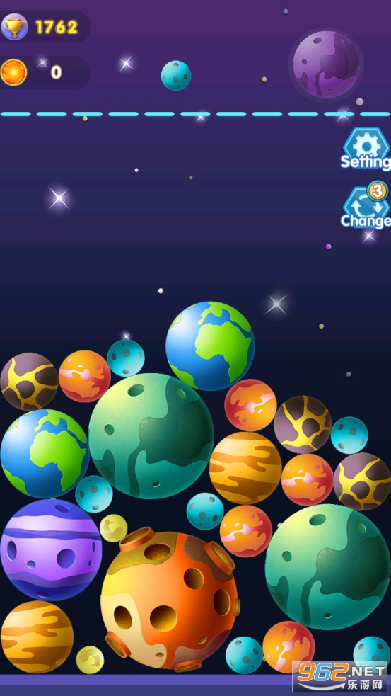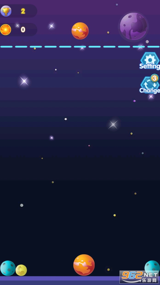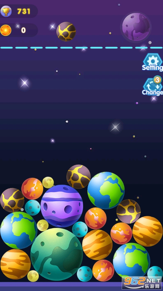 趣味的合成游戏,以星球为题材,可以将星球合并成其他的星球,比如月球、水星、木星、太阳等等,不断的合成获得各种各样的星球,注意如果堆满了挑战就结束了,喜欢的朋友可以下载试试。