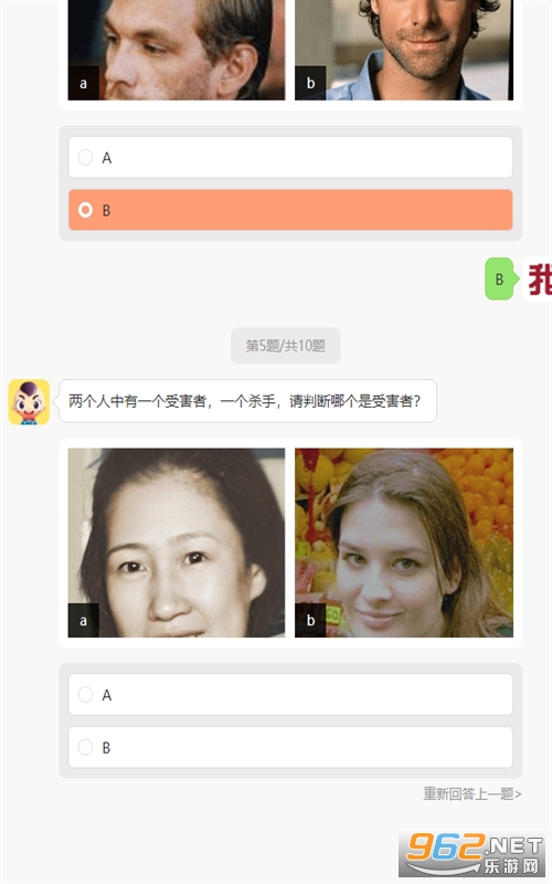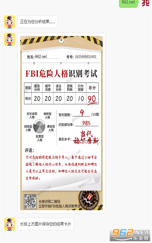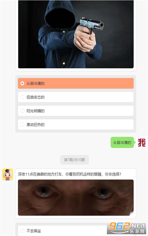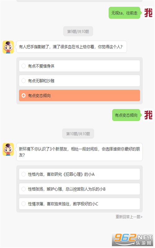还挺有意思的一款识别危险人格的小游戏,通过答题的方式来看看你属于什么水平,小编自己测试了一下,只做错了一道题,如果做错的太多的话需要提高一下你的警觉能力了哦!