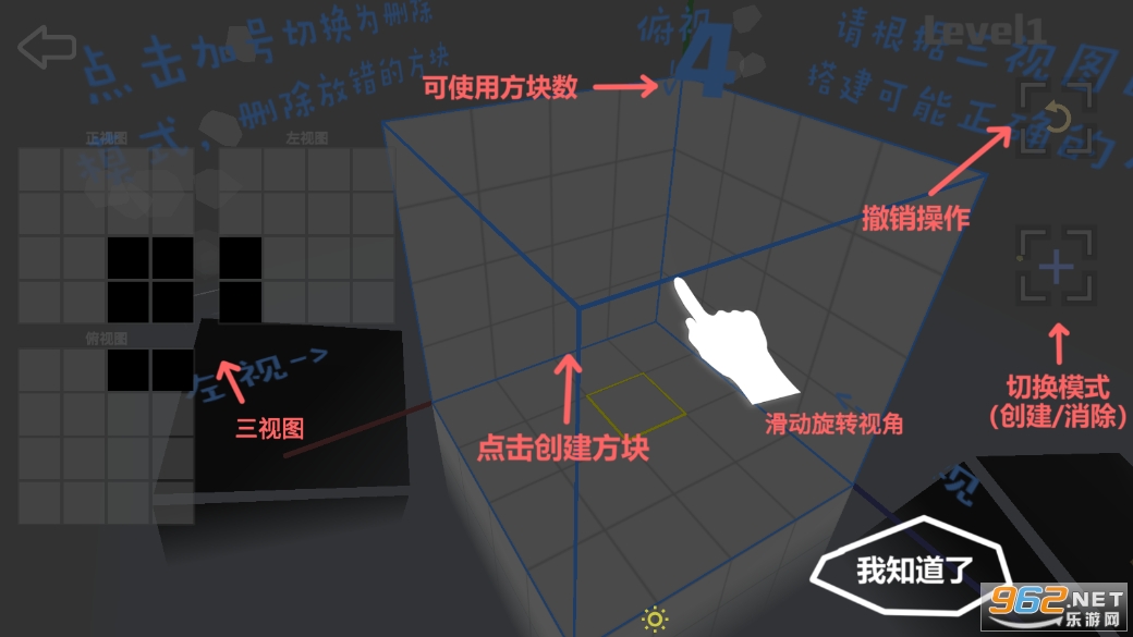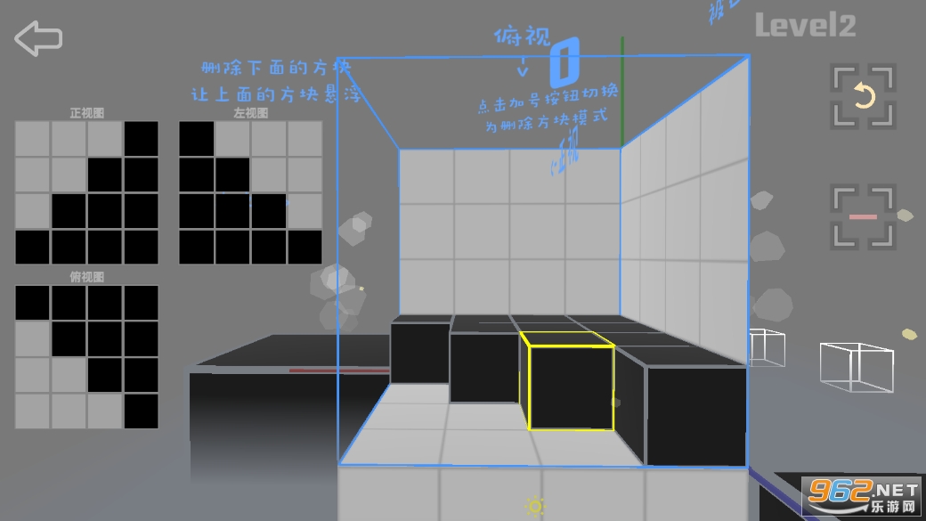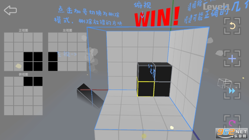游戏为大家创造了一个三维空间,有很多小方块,你需要让他们到适当的位置,通过简单的点击操作。