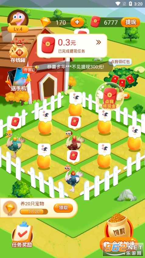 这是一款非常靠谱的经营赚钱游戏,除了养鸵鸟合成鸵鸟来赚钱之外,还能在农场种植一些果树蔬菜之类的,搭配着一起来经营赚钱,另外还有免费领手机的任务,只要你按照上面的要求完成任务就能免费领取平台的手机了。