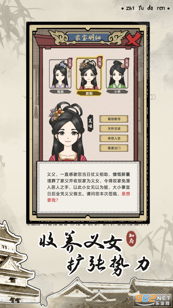 收养义女 —— 在这个乱世之中,总会有些可怜人儿出现,在这里你可能有机会能遇到一些身世坎坷的可怜女子,如处理得当将有机会将其收为义女。