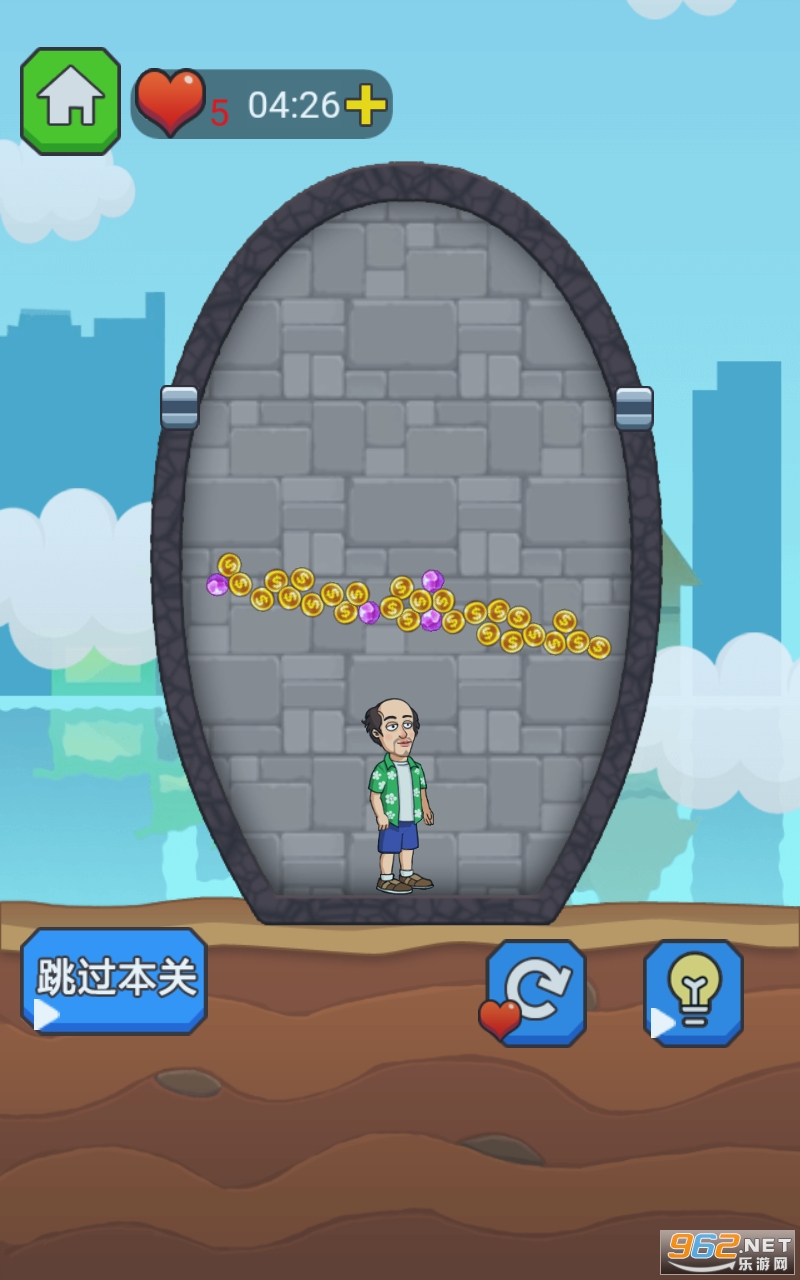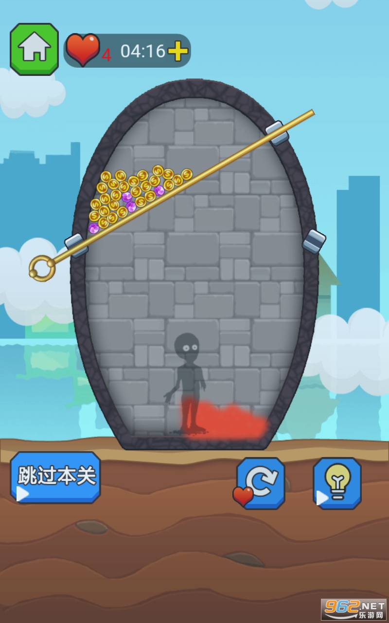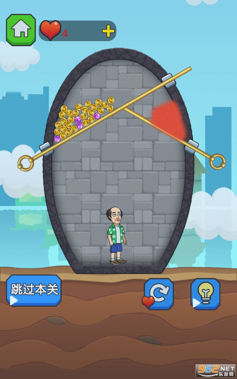 2、这款游戏采用关卡解谜的模式进行,如何通过拉针的方式来拯救下方的被困英雄呢;