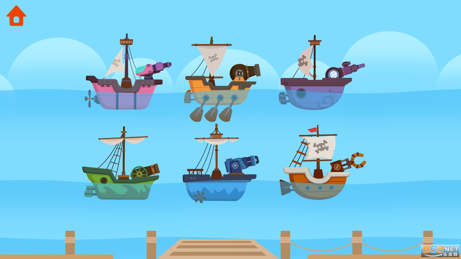 驾驶6艘独具特色的海盗船:机械手船、水枪船、火球船、磁力波船、激光船、火炮船