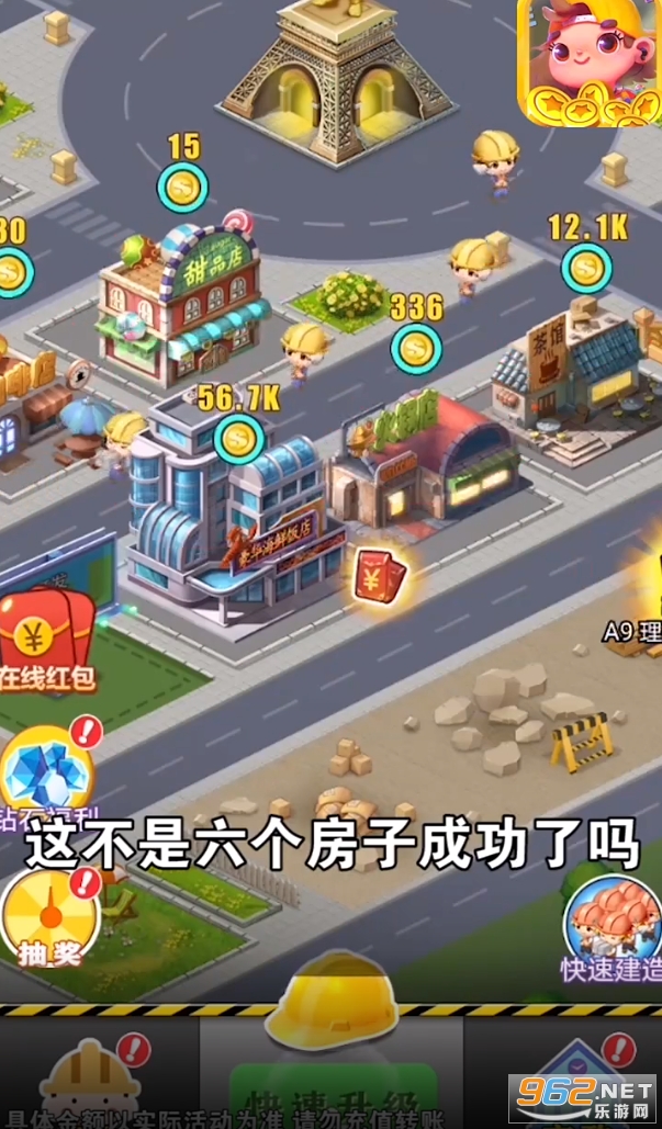 2、召集更多工人建造房子,房子越多红包越多,10元红包直接到账。