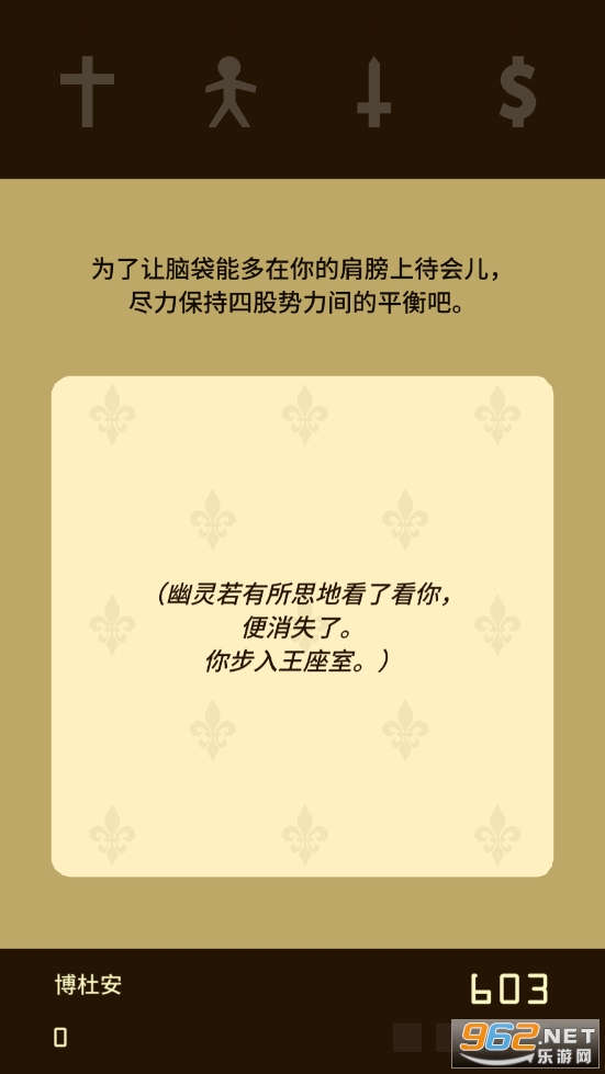 皇家权术的国王生涯游戏,游戏中玩家们需要经历一个国王的一生,努力平衡整个国家的各种势力的权利等,当玩家的侧重点放在某一个势力上时会遭到暗杀等各种离奇的事件哦,在卡牌的轻巧滑动之间一份国王的体验生涯就能完整的体验到