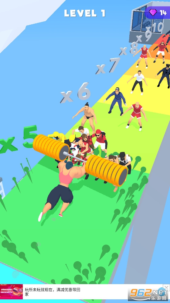 一款非常有趣的休闲闯关游戏,在游戏过程中,你将不断的增加你的负重锻炼你的肌肉,躲避各种障碍,然后大发神威,将面前的对手全部撞飞,游戏的操作简单容易上手,还有着超多的皮肤等你解锁。