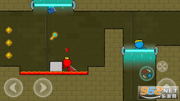 3、帮助红色和蓝色的两个小人,通过相互的合作,一起躲避障碍陷阱成功闯关。