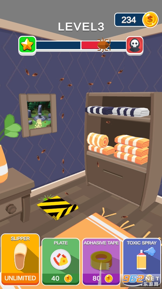 一款非常有趣的以消灭蟑螂为核心的休闲游戏,玩家在游戏中的目的就是消灭关卡中的每一只蟑螂,玩法非常有趣,必须要在规定的时间内消除才可以,不然蟑螂会越来越多哦!