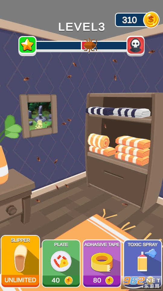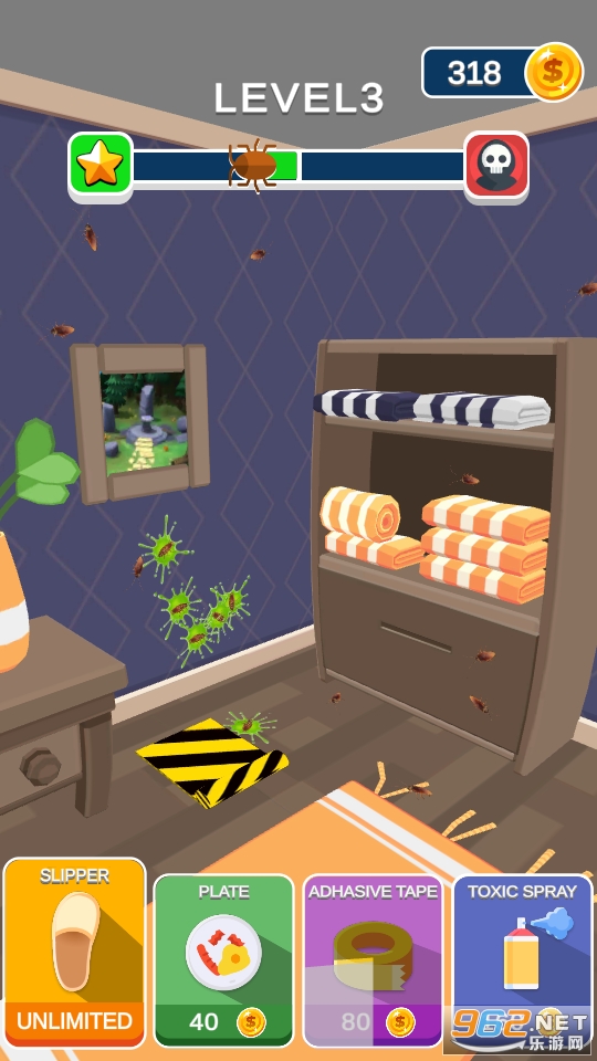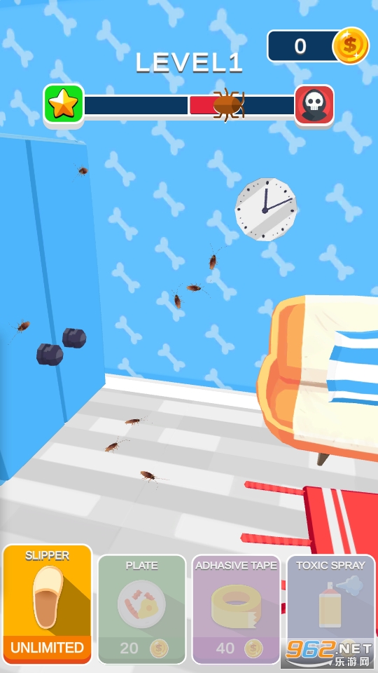 3、玩家可以灭杀蟑螂获得金币的奖励,然后解锁各种各样的道具用来杀蟑螂。