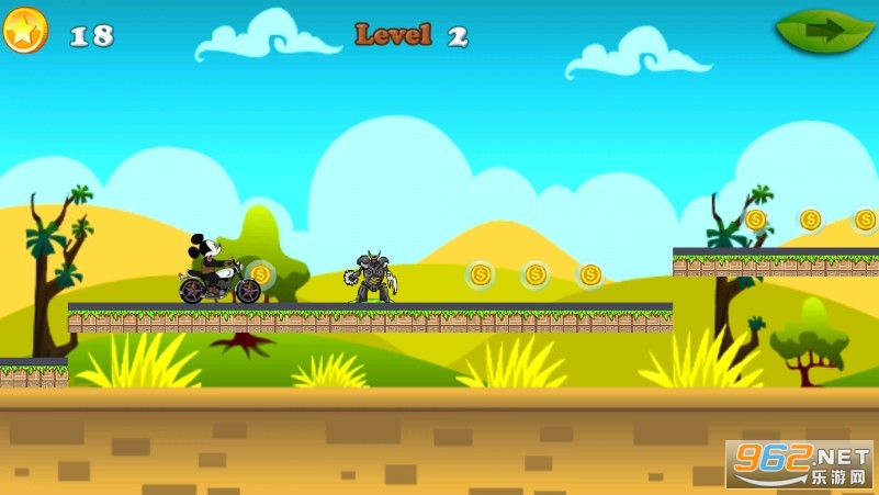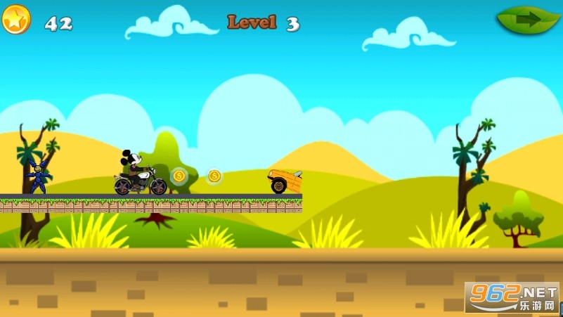 《米奇冒险骑士》是一款卡通画风的休闲闯关游戏,采用的是2D横版风格,可爱的米奇骑着它心爱的摩托车开始闯关了,控制好避开障碍物,千万不要想着撞开障碍物,里面的障碍物非常坚固,会将米奇的摩托车撞坏的,跳跃避开障碍,有些时候能借助道具哦。