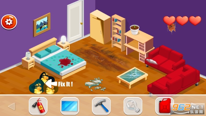 《修复损坏的房屋》是一款好玩的模拟修房子的游戏,选择合适的工具去修复常年失修的房子,用锤子和木板修复破损的地板,用拖把清理地板上的积水,灭火器灭掉刚起的火苗,修复两侧的门窗,这些工作都需要你独自一人完成,一定要选择正确,不然是不能进行修复的。