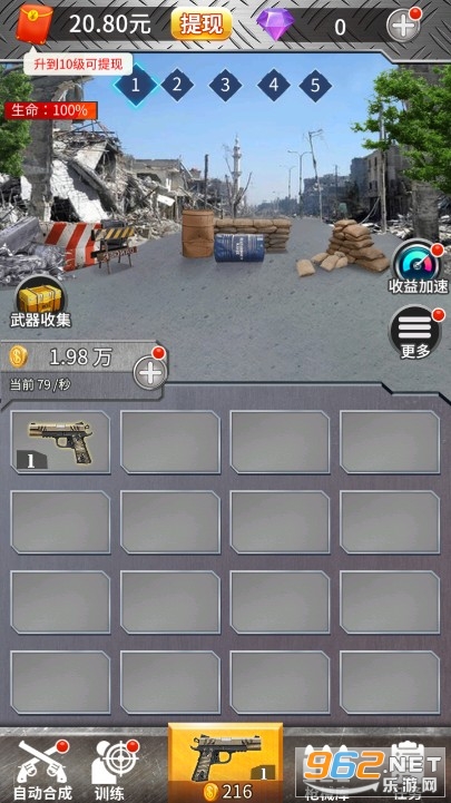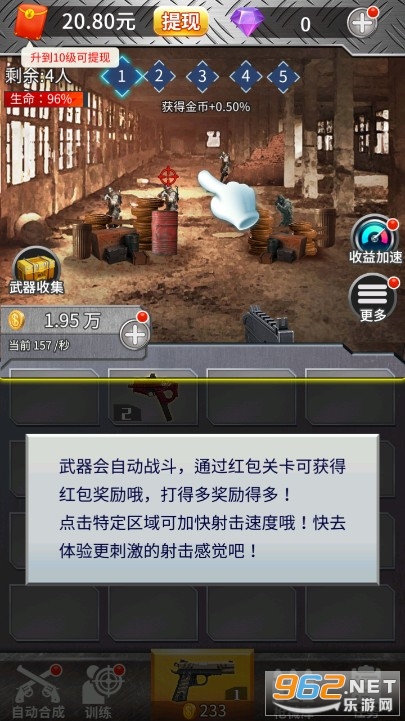 一款非常休闲还可以赚钱的合成类游戏,战斗的方式很简单,你只需要进行合成并放置就可以自动战斗啦,合成的枪越高级,威力越大,你点击屏幕的速度越快,获得红包的速度就越快,全新上线放置合成游戏,等你来体验。