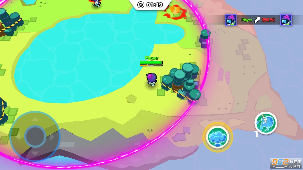 多样化的角色选择,玩法还挺有意思的,左边控制前进的方向,右边控制着进行攻击,打败其他的角色就可以了,注意合理的对掩体进行利用,赛程进行到一半还会缩小生存空间,有点类似吃鸡游戏的跑毒了。