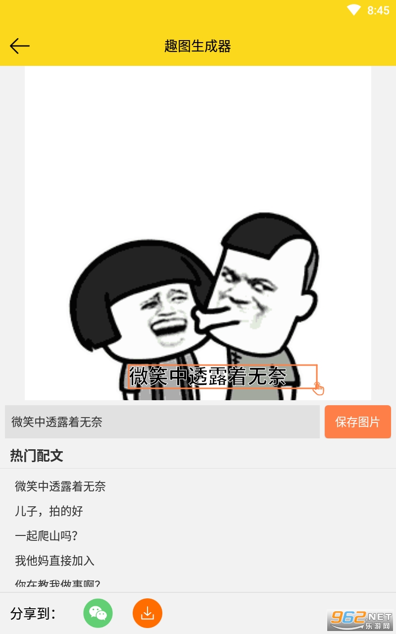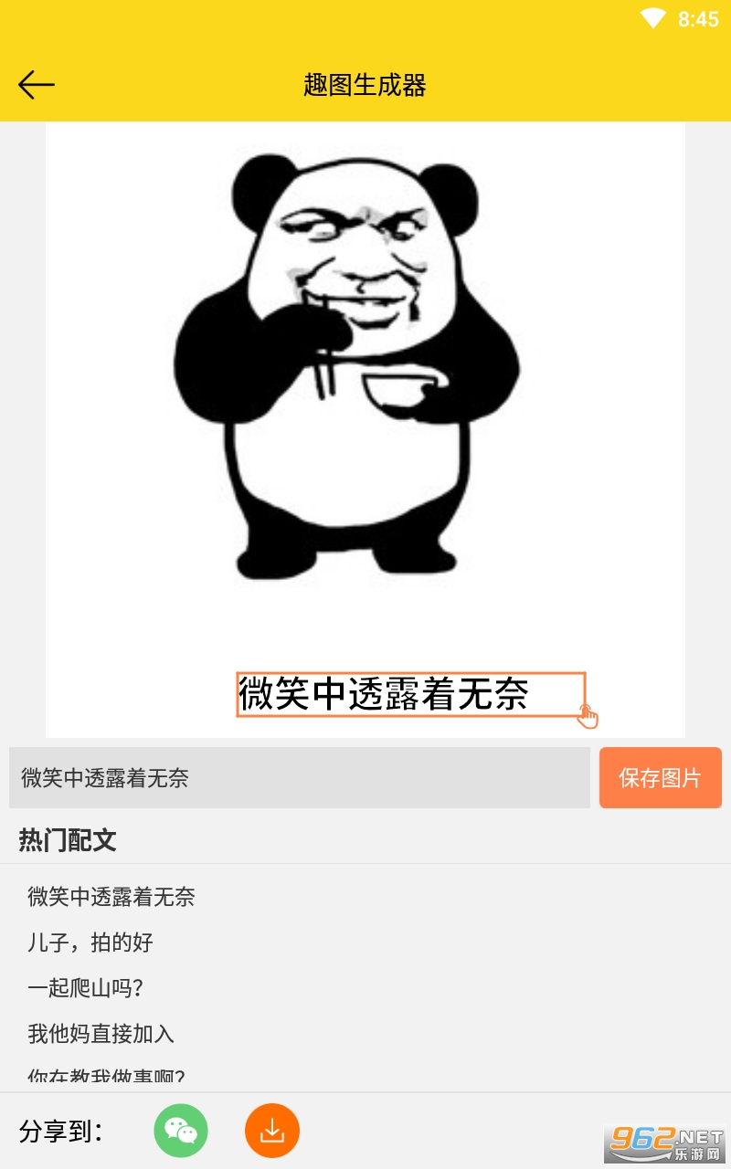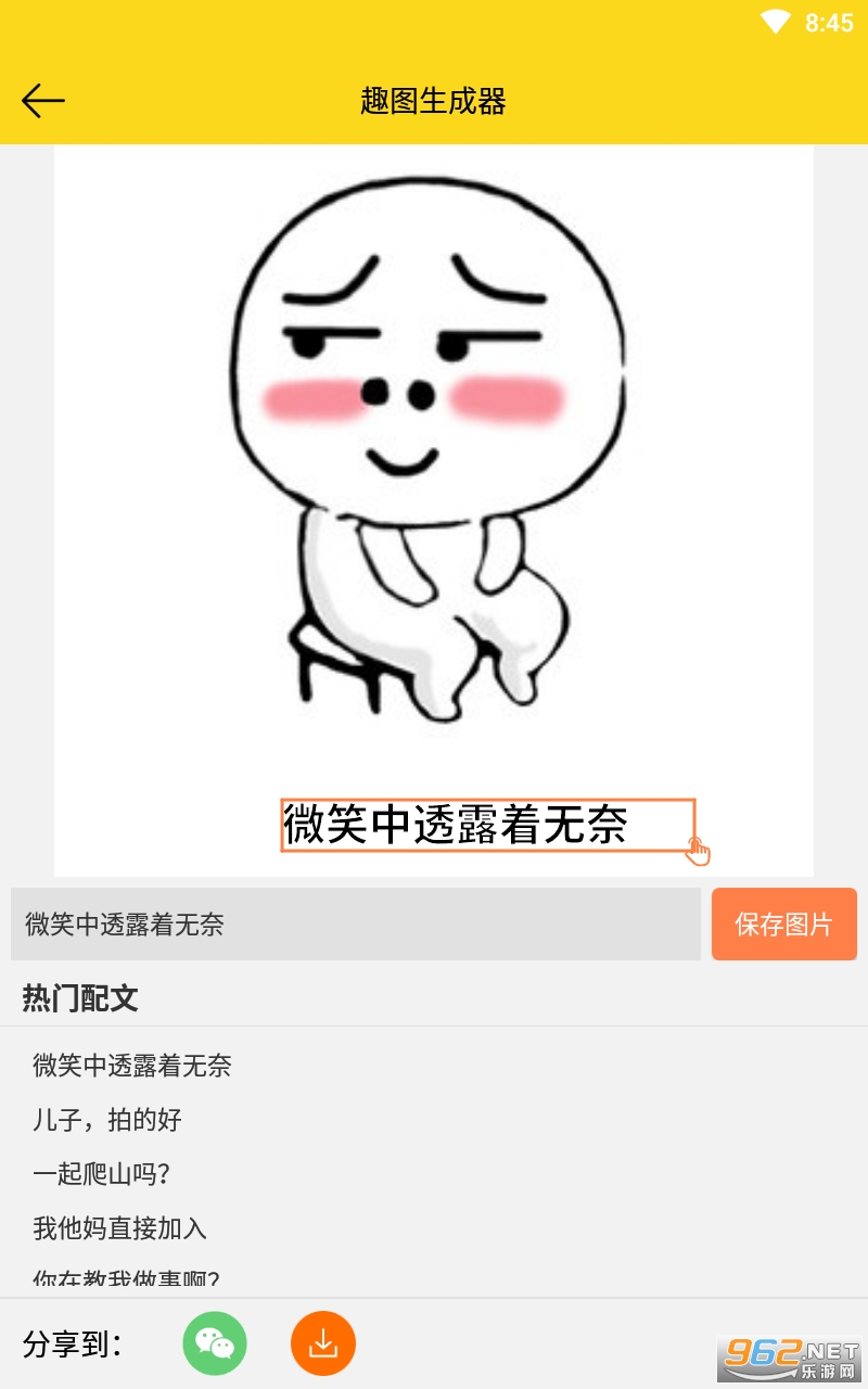 总体来说是一款非常不错的表情包生成软件,简单的排版,用户们只需要在文本框中输入对应的文本并且调整未知即可生成对应的表情包图片哦,喜欢的亲们赶紧下载吧。