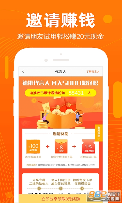 特点:邀请一个人试用可以赚8元,奖励到二级,二级粉丝奖励2元。