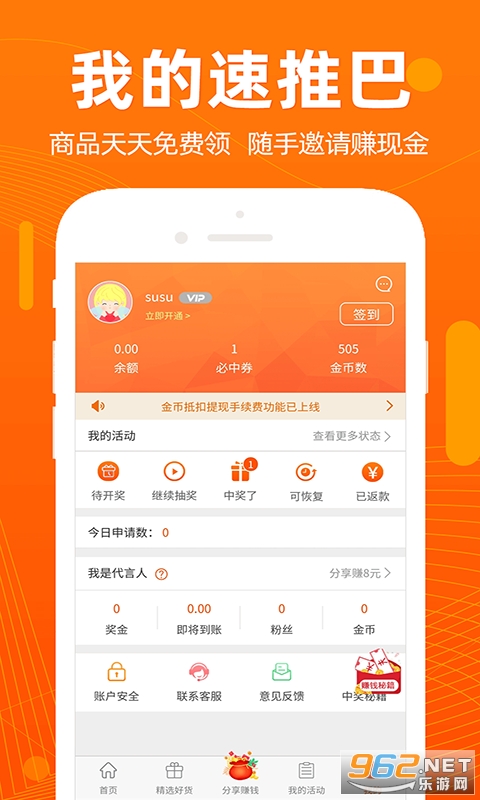 速推巴是一个超值省钱购物的电商导购平台。每日更新大量优质精选宝贝,统统免费领取,购物即可全额返现;分享即可赚钱,邀请朋友还可获得8元现金!每日早晨10点,晚上9点开奖两次,中奖率极高!