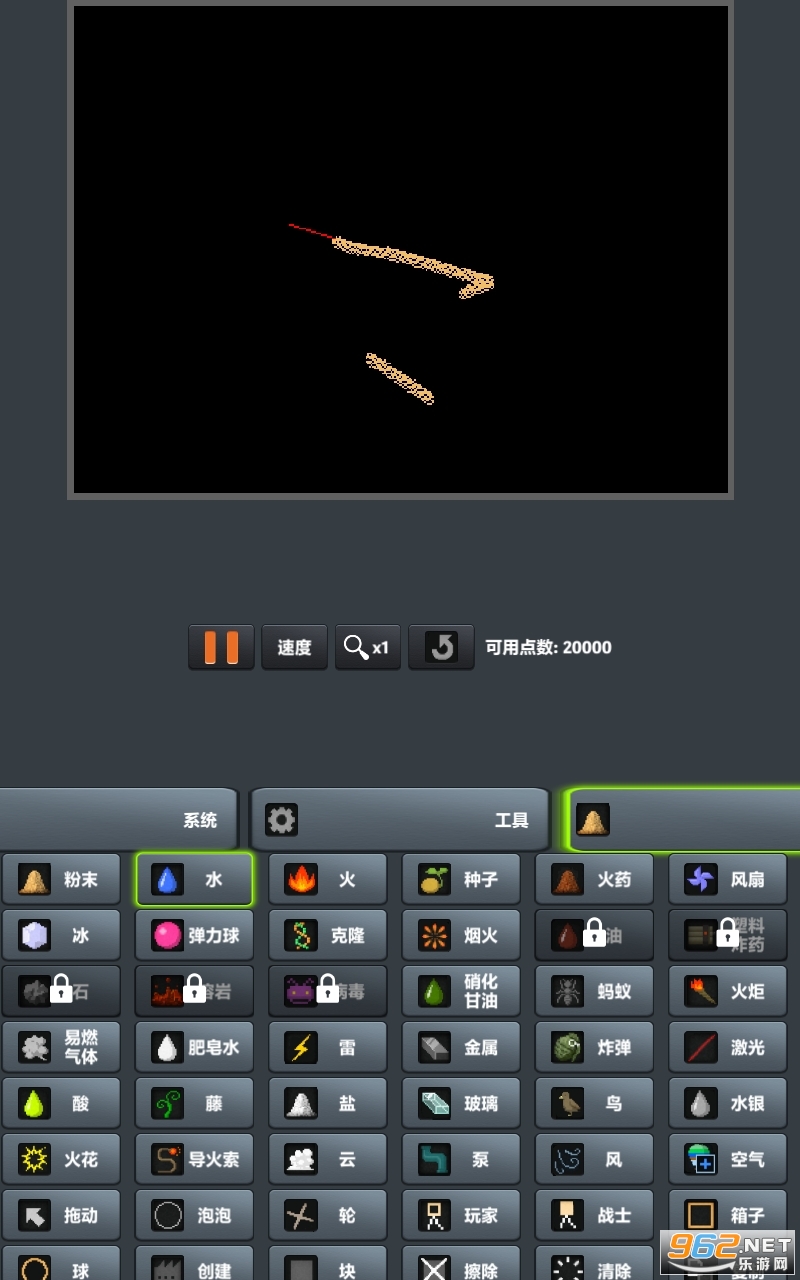 《粉末世界汉化版》是一款融入了物理机制的沙盒模拟游戏,这里有水,火,土,木,油,金属等各种各样的固体,液体和气体,还有蚂蚁,虫子,鸟等等动物,炸药,硫酸等等物品,让玩家自由的发挥你的创意,合理组合,在这里模拟有趣的实验!