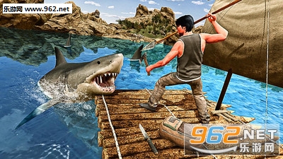 游泳,狩猎,战斗鲨鱼和探索浩瀚的海洋在木筏。