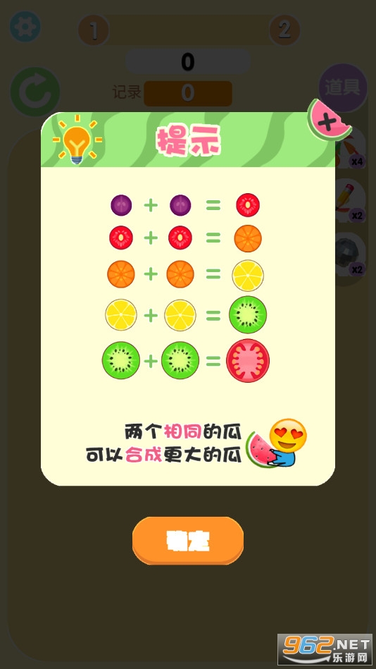 相同的水果互相解除后会变成更大的一种新水果(类似2048),而最大的水果就是“大西瓜”了(因此游戏名叫合成大西瓜);