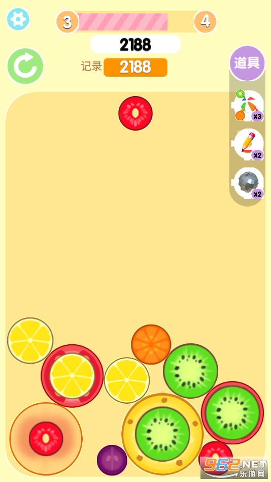 玩家只需要将相同的水果放置在一起就可以直接进行合成出更大的水果,在经历了一系列合成后就可以产生西瓜了,游戏主要考验的也是玩家对空间合理安排的把握。