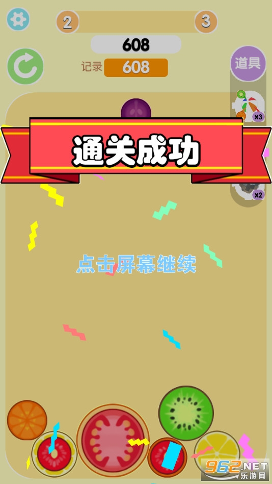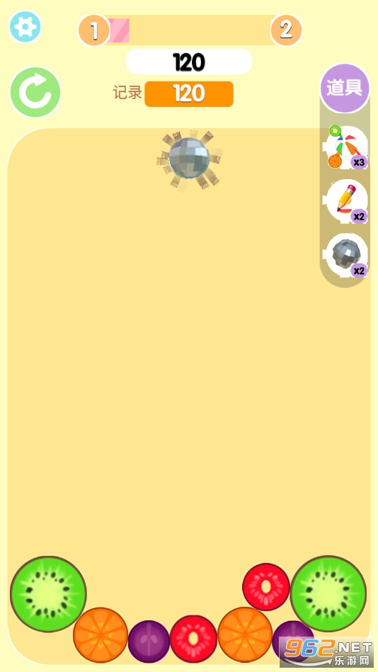 游戏画面上分每次将出现各种各样的水果,玩家要做的就是选择一条纵坐标将这个水果扔下去(类似时间暂停的俄罗斯方块);